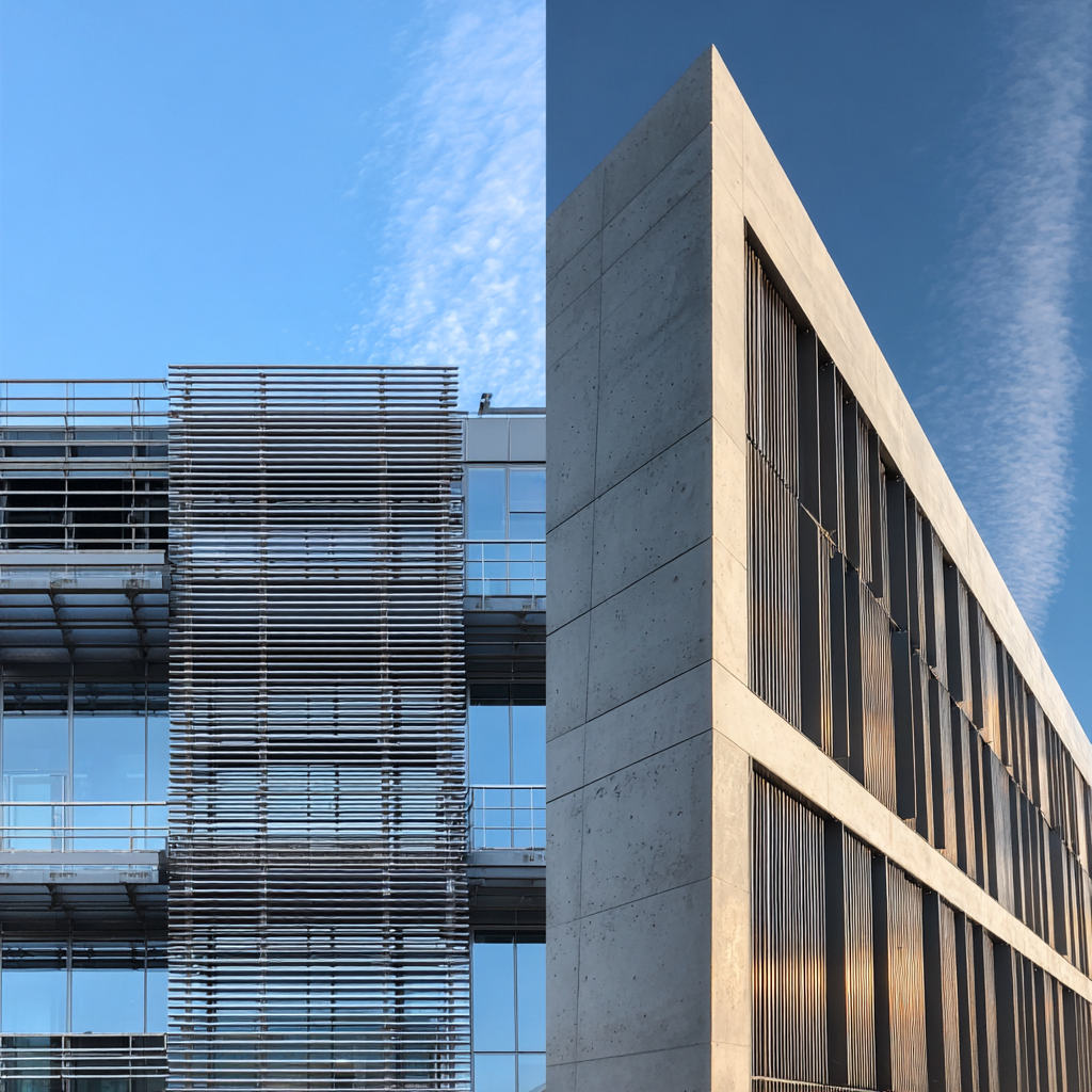 | Impacto estético | Leitura mais horizontal, comum em edifícios corporativos | Leitura mais dinâmica e vertical, muito usada em fachadas contemporâneas |